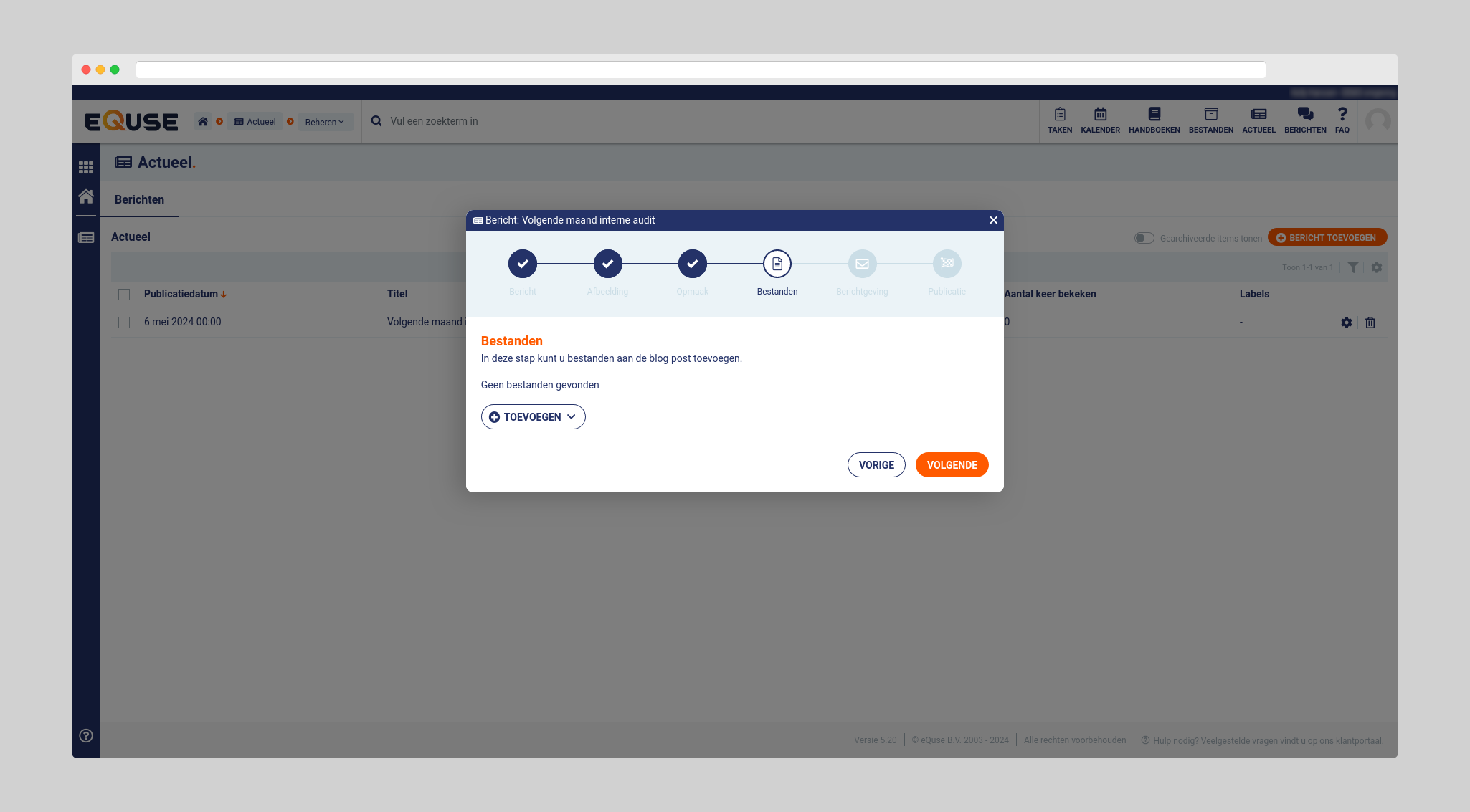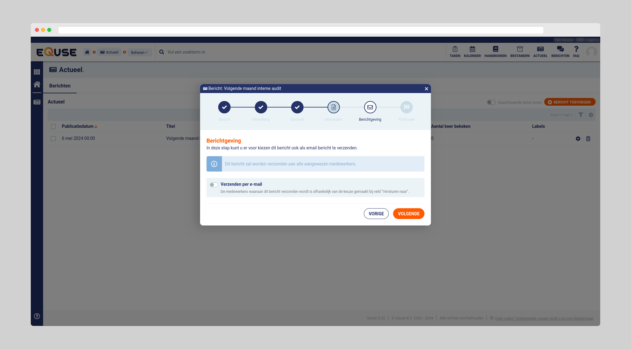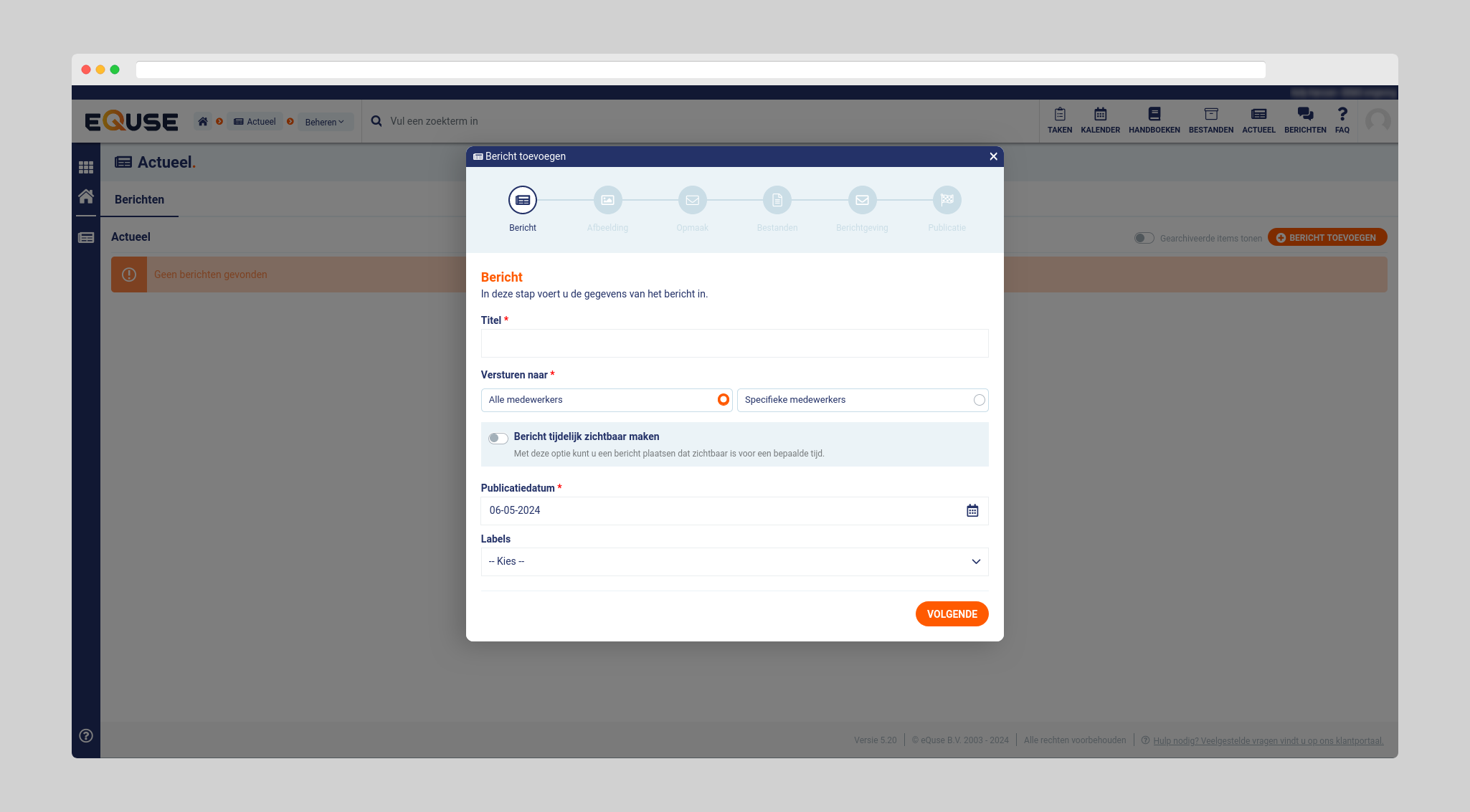 Als u de module geopend heeft, dan kunt u rechts in het scherm op “bericht toevoegen” klikken om een nieuw actueel bericht te versturen. In het eerste scherm dient u een titel van het bericht te vermelden. Daarnaast moet u de keuze maken naar wie het bericht verzonden wordt, wie kan het allemaal zien? Is het bericht voor iedereen of voor specifieke medewerkers? Daarnaast is er ook de optie om het bericht tijdelijk zichtbaar te maken. Als laatste moet u de publicatiedatum instellen.