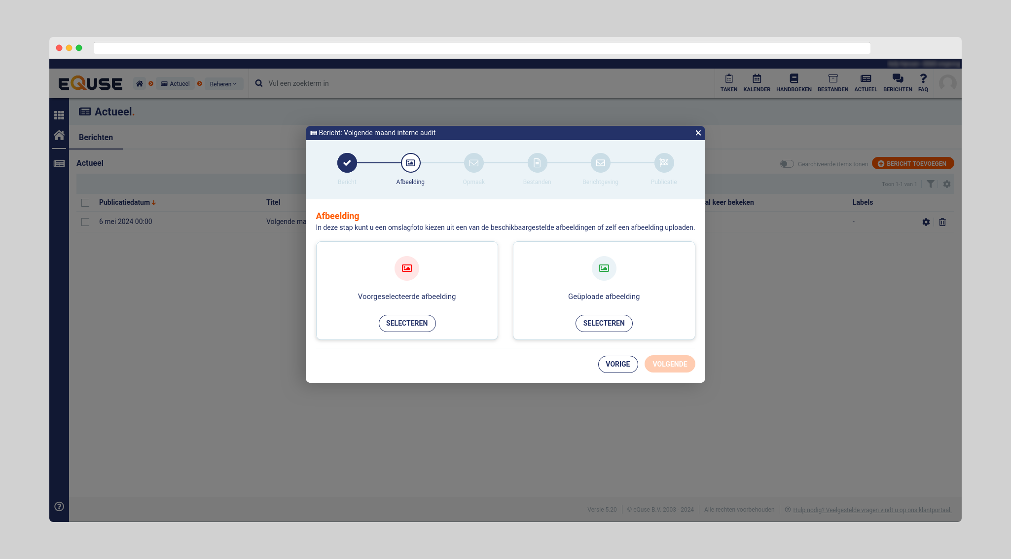Vervolgens dient u een afbeelding te selecteren. Dit kan een eigen afbeelding zijn (toevoegen vanaf uw apparaat) of een standaard afbeelding van ons. Dit is de afbeelding die als eerste zichtbaar is wanneer een collega het bericht bij “Actueel” ziet staan.