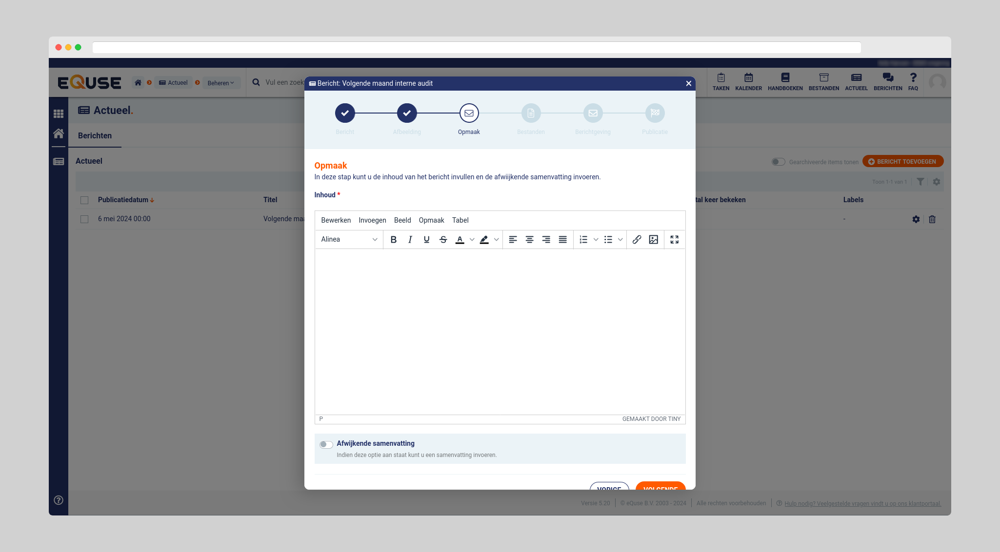 Nu bent u bij de stap “Opmaak”. Hierin verwerkt u de gewenste informatie die u graag wilt delen met de hele organisatie of een geselecteerde groep collega’s. Hier kunt u volledig uw eigen gang in gaan, er zijn opties zat! Als extra kunt u nog een “afwijkende samenvatting” toevoegen. Zoals de woorden al aangeven, dit kunt u gebruiken wanneer u een afwijkende samenvatting wilt toevoegen aan het bericht. De samenvatting is voor iedereen zichtbaar in het overzicht van de module “Actueel”.