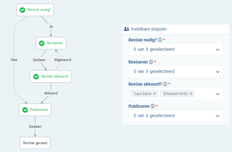 Iedere stap (taak) is gekoppeld aan één of meerdere medewerkers die verantwoordelijk zijn voor het correct afhandelen van die taak.